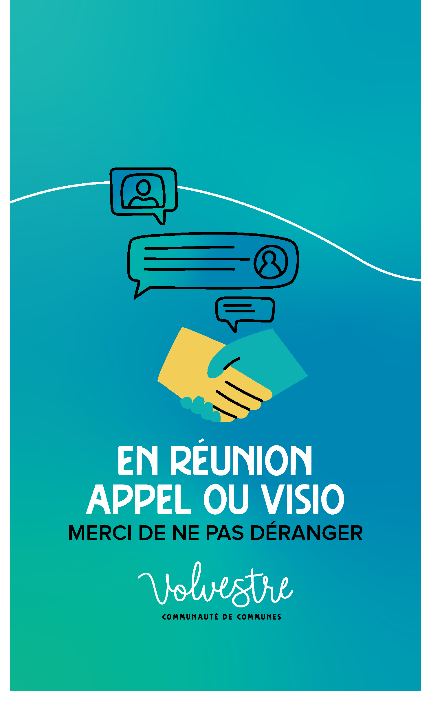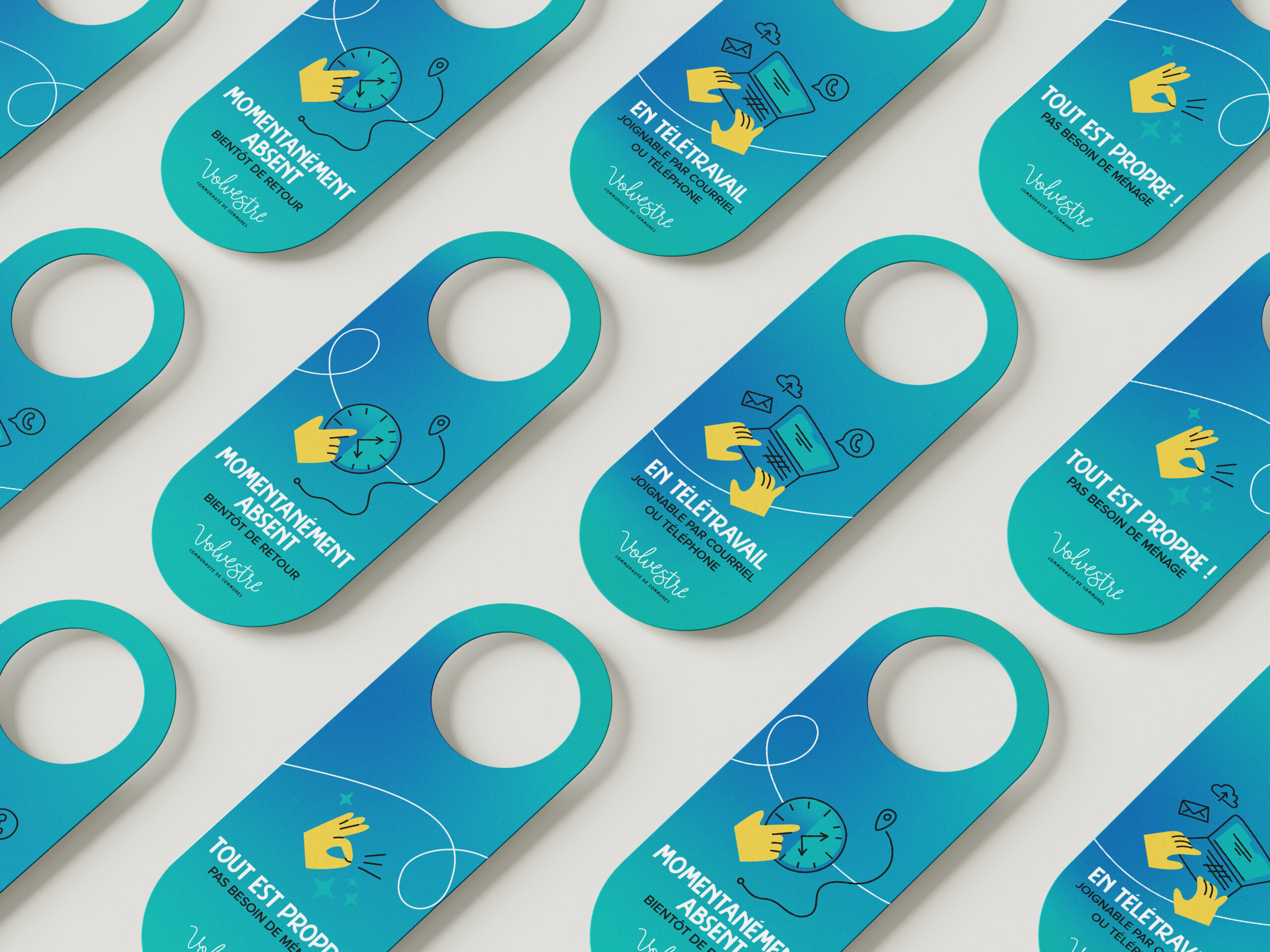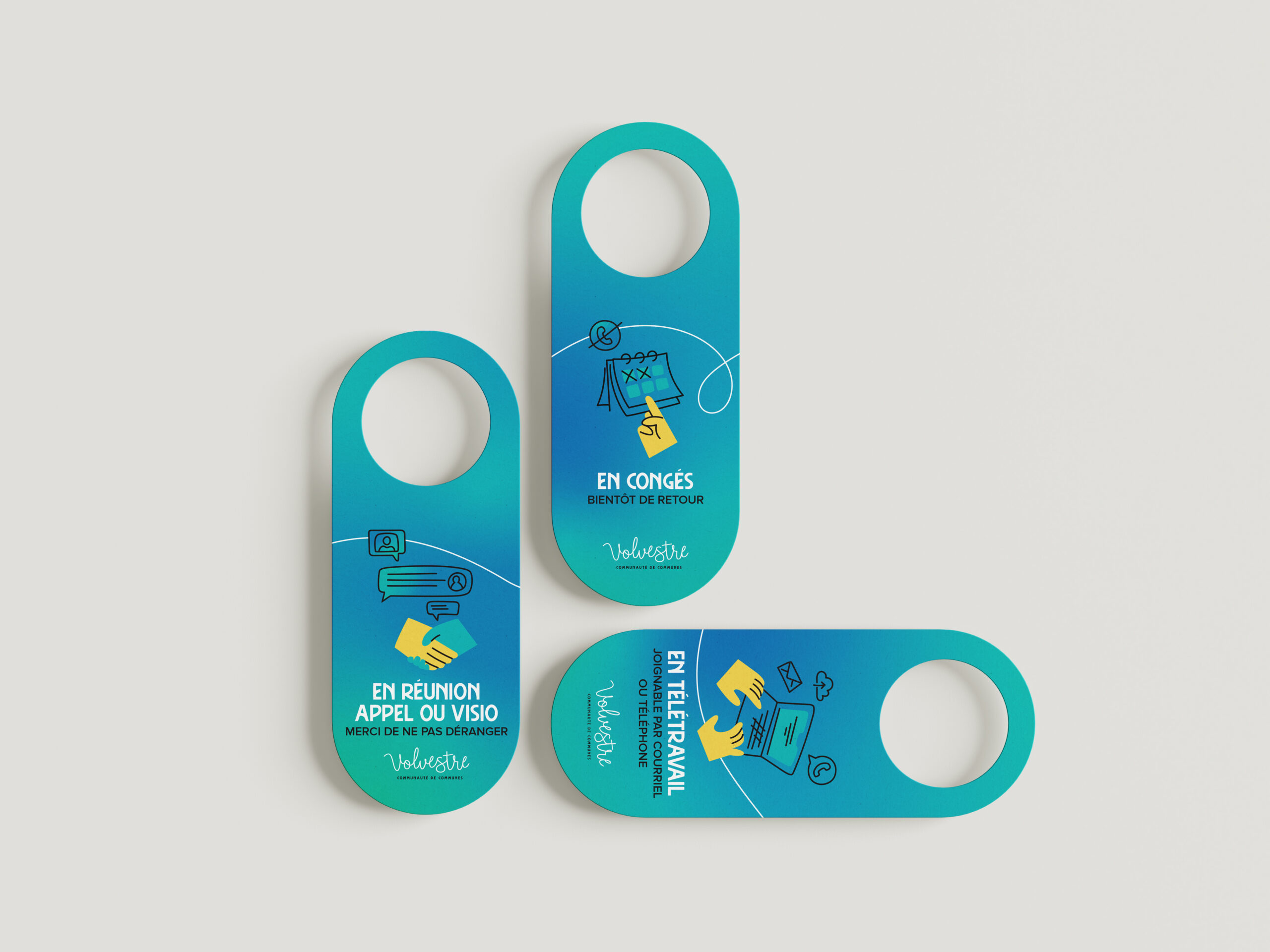 Série de trois accroche-portes recto-verso, avec illustration personnalisée et mise en page claire pour une signalétique simple.