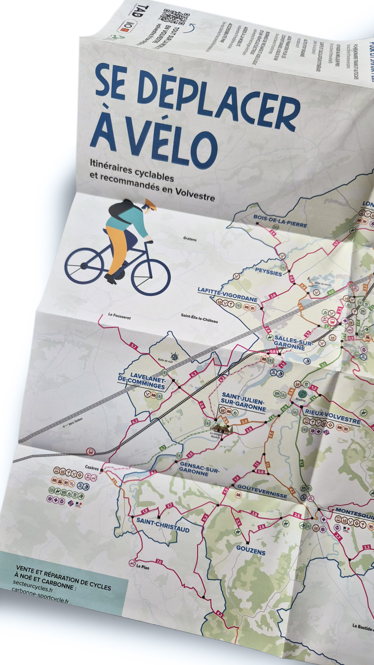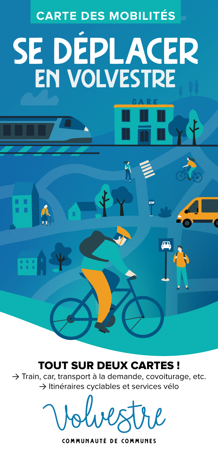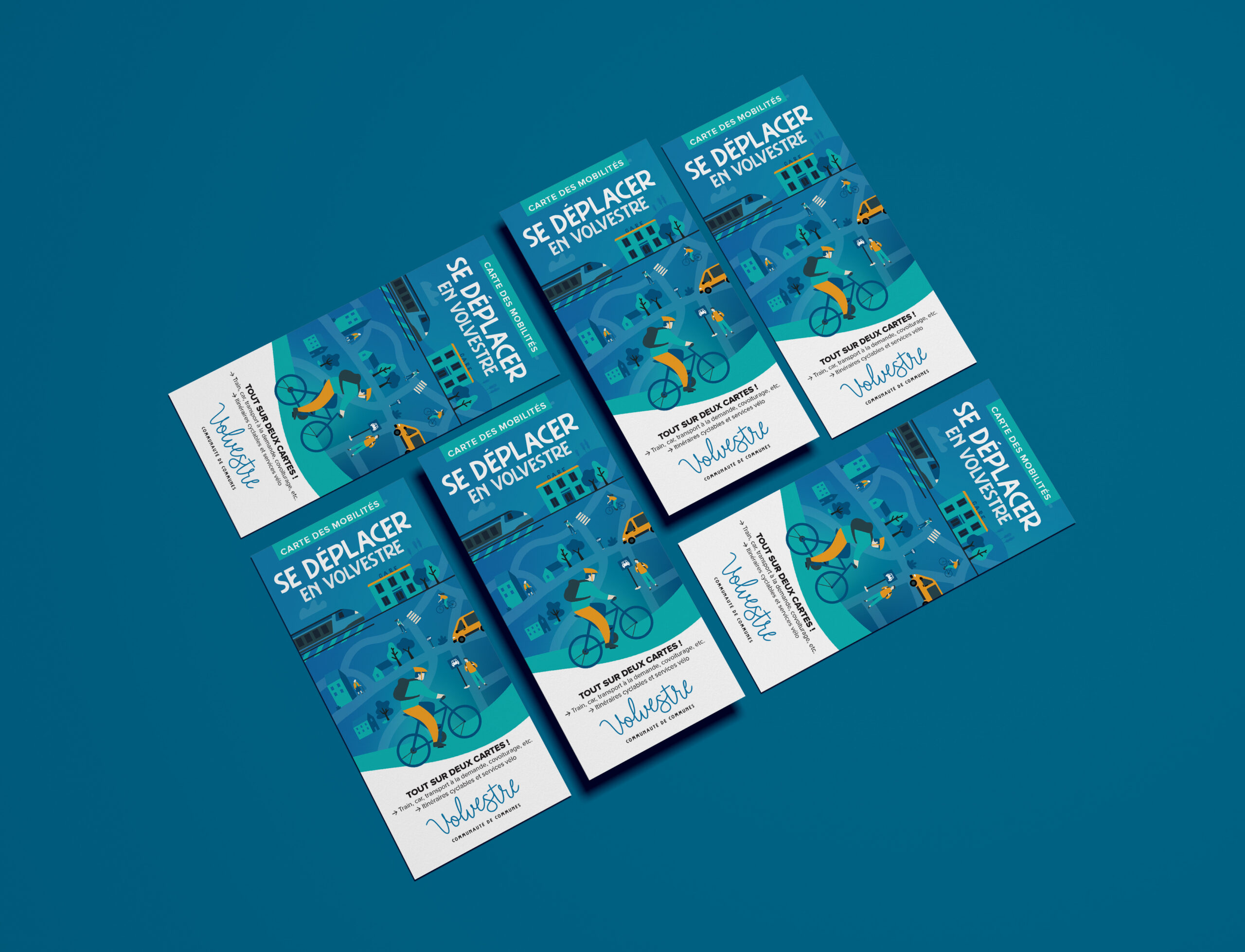 Carte des Mobilités en format A2 fermé, conçue en dépliant 5 plis accordéon + 1 pli croisé. Couverture illustrée. Pensée pour représenter les différentes mobilités du Volvestre dans un univers clair et accessible.